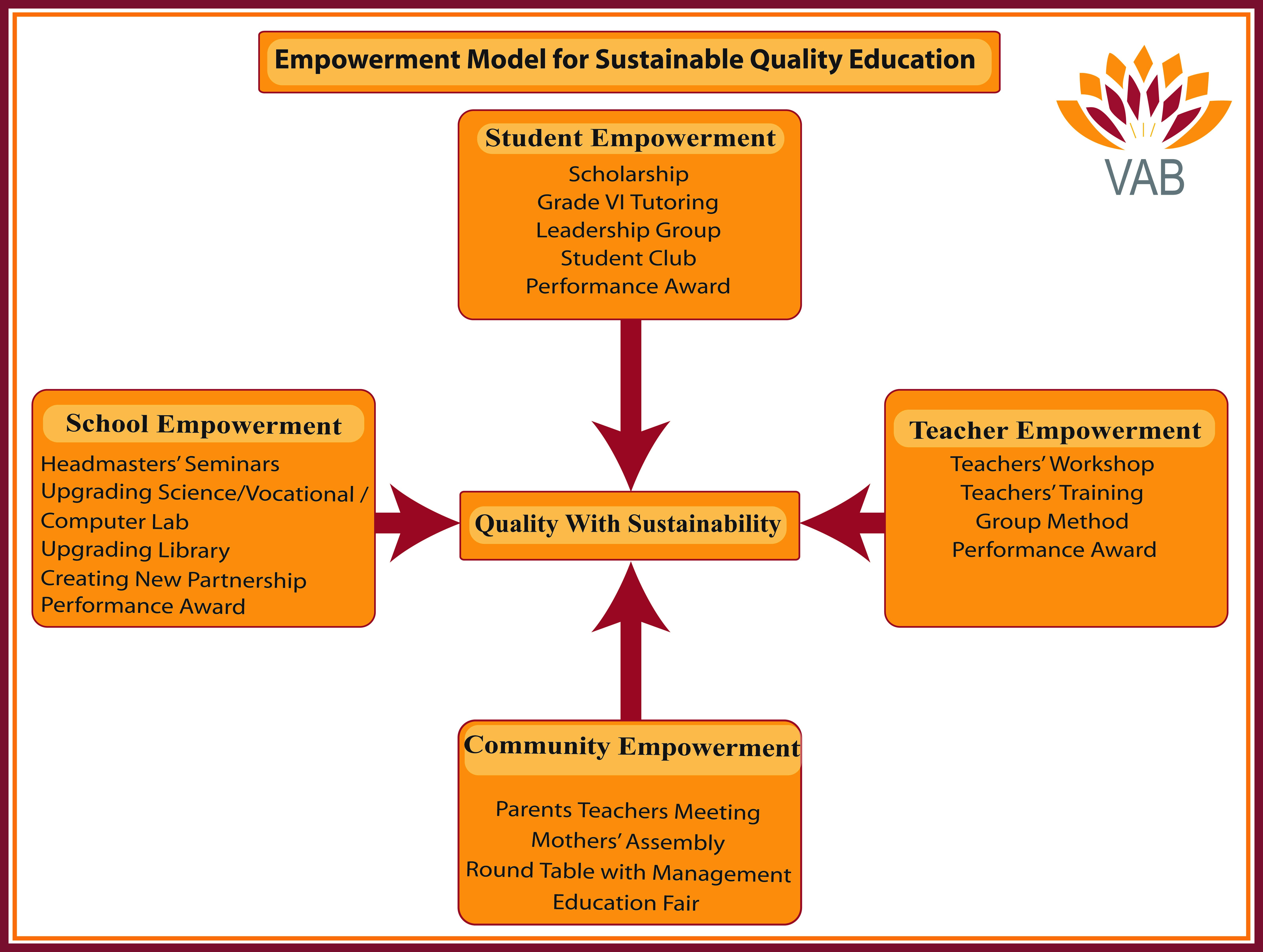VAB has, developed and is implementing a program consisting of four sets of empowerment measures with the aim of addressing the issues of access to and, in particular, quality of secondary education in the non-government high schools in rural Bangladesh, partnering with the schools themselves and involving students, teachers, schools and communities.